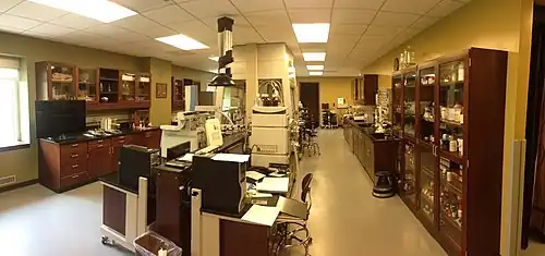 Conservation scientists use a variety of microscopic, spectroscopic, chromatographic, and other scientific techniques and instruments to physically and chemically examine objects.[7] Non-destructive techniques are favored by conservation scientists so to preserve the originality, integrity, and current state of the object as much as possible. Such non-destructive methods include visual examination, advanced imaging techniques, and X-rays.[8] Sometimes, sampling an object is unavoidable. In these cases, microscopic fragments are removed from the object- rarely visible to the naked eye- and their original location is documented. The scientific and ethical demands of a conservation scientist require a variety of instruments- taken from mainstream science and slightly modified- in order to conduct their research properly. Listed below are some of the most commonly used instruments in museum laboratories today and how they are used by conservation scientists.