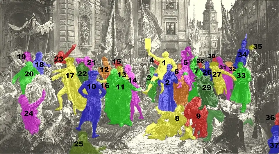 The painting is centered on the Sejm marshal Stanisław Małachowski (1), who is wearing a white, French-inspired costume.[11] Małachowski holds the marshal staff in his left hand and in his right hand, he triumphantly raises the text of the Constitution.[11] Although the historical document was titled Ustawa rządowa (Government Ordinance), Matejko chose to make the title page of the document as portrayed in his painting more explicit—and at the same time put the name of the painting right in its center.[11] He is carried by deputies Aleksander Linowski of Kraków (2) (on his right) and Ignacy Zakrzewski of Poznań (3) (on his left).[20] Their significance is that Kraków and Poznań are principal cities of two major regions of Poland: Lesser Poland and Greater Poland, respectively. Under Małachowski's right hand there is a figure with a bandaged head holding a flag; this is Tadeusz Kościuszko (4), and his head wound is a reference to the battle of Maciejowice, which took place during the Kościuszko Uprising in 1794, three years after the event depicted in the painting.[18][20] To the left of Kościuszko, is a figure identified by Wrona et al. as Prince Adam Kazimierz Czartoryski, although this is disputed by other sources.[20]