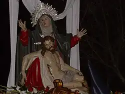 ^It consists of a bench with paintings of St. John the Baptist, St. Francis, St. Bernardino and the Magdalena. The main box is occupied by the high relief of the Pietà (known as the Fifth Anguish), work of Gregorio Fernandez. In the attic is the Imposición de la casulla a San Ildefonso, by the painter Diego Valentín Díaz.
