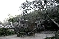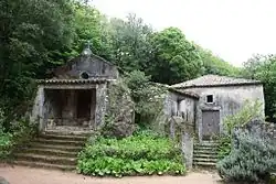 The site is located in the rural part of Sintra, along the northeastern flank of the Sintra Mountains, approximately 325 metres above sea level, in a location marked by dense vegetation and accentuated slopes, near King Ferdinand II's hunting grounds (Tapada D. Fernando II).[3] The convent, surrounded by a forest of oak and shrubbing species of trees, is walled into an area of rocks and exposed boulders. Along Sintra's old road connecting the village to Colares and near the Palace of Monserrate, there is a road that heads towards this religious retreat, indicated by a 17th-century marker: "CAMINHO PARA O CONVENTO DE SANTA CRUZ DA SERRA, VULGO CAPUCHOS; 1650". Access to the grounds is made by a portal (in the southeast corner of the site), or by the Terreiro das Cruzes ("Terrace of Crosses"), an irregularly walled enclosure with a calvary located in the southwest corner and visitor centre.[1][3] To the left of the cross in the Terrace of Crosses is the principal entrance, or Pórtico das Fragas ("Portico of the Rocks"), with an access-way comprising two large boulders, one of which is surmounted by a bell-gable.[1] From the walled enclosure, a small flight of stairs leads into the Terreiro do Campanário ("Terrace of the Belfry"), a small irregular patio with a cross, which leads to the buildings.[1][3] The southeast entrance, located a further distance from the visitor centre, comprises a gate and ancillary building, which leads directly to the much larger Terreiro do Fonte ("Terrace of the Fountain").[1][3] So named because of the large octagonal water fountain, the terrace is a principal square within the retreat, with bunk seating in rock around its edges. Legend suggests that King Sebastian would eat his meals around this fountain when he visited the convent.[1] The fountain itself shows vestiges of 17th-century azulejo tile.[3]