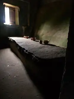 The interior dependencies are aligned along several corridors within the complex and broken by small steps formed by the slopes on which the convent was built. Many of the spaces are covered in cork, which acted as an insulator; many of the doors and windows are covered in cork, while the austere floor is composed of stone slabs.[2][3] The personal quarters of the friars, eight in total, are small in size with small entrance-ways and access to the main corridor.[3] Friar António da Piedade, writing in 1728, described the cells as so small that a few of the monks carved out portions of the wall in order to accommodate their feet. The refectory included a large slab that was ordered extracted from the mountains by Henry, King of Portugal and used as a table by the monks, and small cupboard.[3] The relatively small space was connected to the kitchen, with stone and chimney, and rock bunks for counters and spaces carved into the rock.[3] The Casa das Águas ("House of the Waters"), accessible through an exterior corridor to a cistern and spring, was the collection and distribution space for water into the convent, and included a water tank, latrines, and urinal.[1][3] In addition, the complex included a space for novices; an old library with roof covered in cork; an infirmary; hall of penitence; two cells covered in wood; a space for solitude/retreat (located at the highest point in the complex); and the circular Casa do Capítulo, whose access door and walls are decorated in cork, interrupted by a niche.[3]