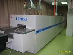 A conveyor belt furnace is a furnace that uses a conveyor or belt to carry process parts or material through a primary heating chamber for rapid thermal processing. It is designed for fast drying and curing of products, and has widespread use in the firing process of thick film and metallization process of solar cell manufacturing. Other names for conveyor belt furnace include metallization furnace, belt furnace, atmosphere furnace, infrared furnace and fast fire furnace.