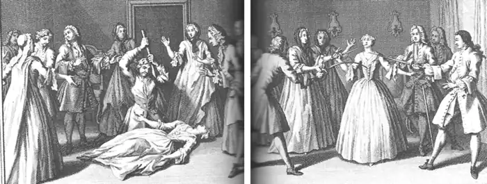 Other sources reinforces this view. In 1732, a visitor from another parish was quick to note that the convulsions were predominant among women.[31] The robe de convulsionnaire was invented to facilitate the convulsions for women. The reports of police spies referred to the female convulsionaries as prostitutes who allowed others to beat and torture their half-naked writhing bodies.[32] Philippe Hecquet, a Jansenist physician who sought to distance the Jansenist movement from the convulsionnaires phenomenon, claimed that female biology and moral inferiority were the causes of the convulsions.[33] By contrast, defenders of the convulsionnaires tended to minimize the role of women and emphasize the social diversity of the movement.[34]
