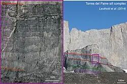 The radiometric age for the quartz diorite at Cerro Paine is 12 ± 2 million years by the rubidium-strontium method and 13 ± 1 million years by the potassium-argon method.[8] More precise ages of 12.59 ± 0.02 and 12.50 ± 0.02 million years for the earliest and latest identified phases of the intrusion, respectively, were achieved using Uranium–lead dating methods on single zircon crystals.[9] Basal gabbro and diorite were dated by a similar technique to 12.472 ± 0.009 to 12.431 ± 0.006 million years.[10] Thus, magma was intruded and crystallized over 162 ± 11 thousand years. High resolution dating and excellent 3-D exposure of the laccolith and its vertical feeding system allow detailed reconstruction of the Torres del Paine fossil magma chamber history.[11]