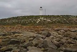 Corny Point is a headland located on the west coast of the Yorke Peninsula in South Australia about 37 kilometres (23 miles) north west of the town of Warooka. The point is described as being "a sloping rocky double projection..." where the "coast on the N[orth] side is low and sandy whereas the coast on the S[outh] side is higher than the point itself."[2] It is the south headland of Hardwicke Bay. It was named by Matthew Flinders on 18 March 1802. The waters adjoining its shoreline are within the Southern Spencer Gulf Marine Park. Since 1882, it has been the site of a navigation aid in the form of a lighthouse.[1][3][4][5][6][7]