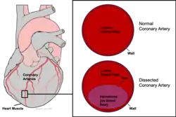 SCAD symptoms are the result of a restriction in the size of the lumen of the affected coronary artery. A bleed within the wall of the artery (tunica intima) originating from the microvessels that perfuse this muscular layer (vasa vasorum) leads to a collection of blood, or hematoma, between the layers of the artery wall.[1] The hematoma pushes close the lumen, preventing blood from flowing to the heart muscle (myocardium). In some cases (~30%) this hematoma (also referred to as an intramural hematoma) is also accompanied by a tear in the inner most layer of the artery - a monolayer of endothelial cells called the tunica intima. It is not clear if this precedes or follows a bleed within the wall of the artery.[9] The tracking of blood within the artery wall (both in the presence or absence of an intimal tear) is referred to as a "false lumen".[10][11][12] The restriction of blood flow in the 'true' lumen limits the availability of oxygen and nutrients to the heart muscle, or myocardium. As a result, the myocardium continues to demand oxygen but is not adequately supplied by the coronary artery. This imbalance leads to ischemia, damage, and in some cases can lead to death of the myocardium tissue, causing a heart attack (myocardial infarction).