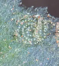 This species of sea slug, along with all other sacoglossan species, are simultaneous hermaphrodites.[10] This means they possess the reproductive organs of both sexes, and produce both types of gametes. They reproduce through internal fertilization, and then spawn their eggs in a unique spiral pattern onto the algae that they eat, Avrainvillea nigricans.[24] This species is also unique because they have poecilogony larvae. This means that their larvae have two different types of development.[25] In several studies it was shown that C. ocellifera can have both lecithotrophic (aplanktonic) and planktotrophic larval development. Lecithotrophic larvae feed from the egg reserves, such as the yolk sacs. Planktotrophic larvae, on the other hand, feed on plankton in the water column.[25] For approximately a month after hatching, the planktotrophic larvae are free-swimming, while the lecithotrophic larvae go through their metamorphosis process while in their eggs.[26][10] Eggs with smaller diameters normally indicate planktotrophic larval development.