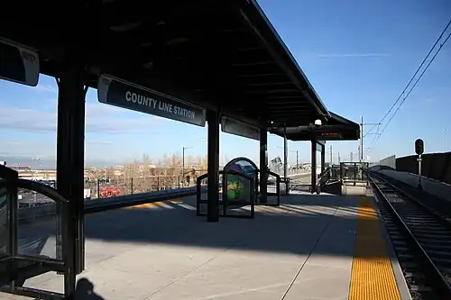 County Line station is a light rail station in Lone Tree, Colorado, United States. It is served by the E and R Lines, operated by the Regional Transportation District (RTD), and was opened on November 17, 2006.[4][5] It serves Park Meadows Mall and features a public art sculpture entitled Plow, created by Emmett Culligan and dedicated in 2006.[6]
