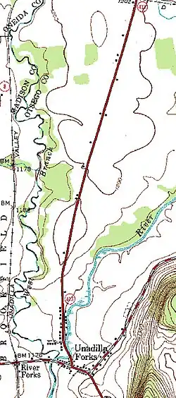 CR 18 continues on through the rural town, passing along the eastern base of the river valley as it intersects CR 18C (Welsh Road), a connector route linking CR 18 to the hamlet of West Edmeston and NY 8. From there, the route heads northeastward through open fields and isolated forests before crossing into the town of Plainfield. Here, CR 18 meets CR 19, an east–west highway connecting CR 18 to the community of Leonardsville. Roughly 2 miles (3.2 km) north of Leonardsville, CR 18 enters the small hamlet of Unadilla Forks. Here, it connects to its two other suffixed routes, both of which connect to county routes in adjacent counties.