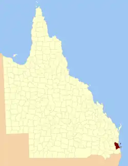 The County of Stanley is a cadastral division centred on the city of Brisbane in Queensland , Australia, that is used mainly for the purpose of registering land titles. It was named after Edward Stanley , who was three times British prime minister in the 1850s and 1860s.[ 1] It is bounded by the Logan River in the south, the Brisbane River at what is now Lake Wivenhoe in the west, the Stanley River at what is now Lake Somerset in the north-west, and Caboolture River in the north. It includes Moreton Island and Stradbroke Island , and extends west to Ipswich 's CBD, south to Loganlea and north to Morayfield .