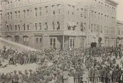 On May 24, the strikers seized the Strong mine on Battle Mountain, which overlooked the town of Victor.[1] The next day, at about 9 am, 125 deputies arrived in Altman and set up camp at the base of Bull Hill. As they started to march toward the strikers' camp, miners at the Strong mine blew up the shafthouse, hurling the structure more than 300 feet into the air. A few moments later, the steam boiler was also dynamited, showering the deputies with timber, iron and cable. The deputies fled to the rail station and left town.[1][16]