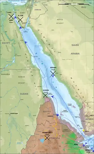 After this crushing defeat at the hands of the Ottomans, he returned with his brother back to Massawa on 22 May 1541 to rejoin the ships they had left there. While at Massawa, his brother Estêvão da Gama attempted to salvage something from this expedition by dispatching an expeditionary force under Cristóvão to assist the beleaguered Emperor of Ethiopia, Gelawdewos. Four hundred Portuguese men-at-arms were selected, 70 of whom were also skilled artisans or engineers, and 130 slaves for this expedition, equipped with about 1000 arquebuses, an equal number of pikes and several bombards.[3] João Bermudes, who had represented himself as the Patriarch of Ethiopia to the Portuguese, accompanied this expedition. An account of this campaign in the Ethiopian highlands was later written by Miguel de Castanhoso, who accompanied Gama and was an eye-witness to almost everything he recorded.[4] The men were landed at Massawa and Arqiqo, the next port south of Massawa, and began their trek inland to Debarwa, the capital of the Bahr negus, or Ethiopian viceroy for the northern provinces.[5]