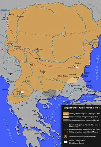 ![]() Bulgaria under rule of knyaz Boris I and 852 campaign against Croatia (middle-left) | |||||||