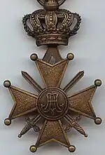 The World War I Croix de guerre was a 40mm wide bronze Maltese cross with 3mm in diameter balls at its eight points. It had a 14mm in diameter central medallion bearing the relief image of a "lion rampant" on its obverse and the royal cypher of King Albert I on its reverse. Two 37mm long crossed swords point upwards between it arms. A 14mm high "inverted V" between the two points of the top cross arm is secured to the inside of a 25mm wide by 25mm high royal crown, the ribbon's suspension ring passes through the top orb of the crown giving the cross a total height of 65mm.[1]