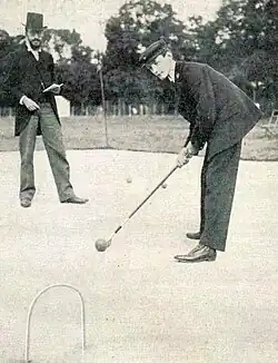 This was the only Olympiad where croquet was part of the official programme, though there was the variant called roque at the 1904 Summer Olympics.[1] All events which were restricted to amateurs, open to all nations, open to all competitors, and without handicapping, are now regarded as Olympic events (except for ballooning).[2]: 12–13  Although croquet satisfied three criteria, it had been thought to have an entrant from Belgium, Marcel Haëntjens,[2]: 27  (Haëntjens is a Flemish name) and thus have been an international competition. Haëntjens is now known to have been from France,[3] as were the other croquet players. Only one paying spectator attended the event.[4]
