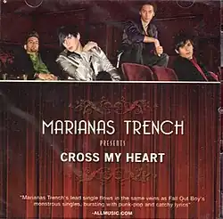 "Cross My Heart" is a song by Canadian pop rock band Marianas Trench. It was released on November 24, 2008, as the lead single from their second studio album Masterpiece Theatre.[2] An acoustic version of the song was released on March 10, 2009.[3] The song peaked at number 15 on the Canadian Hot 100 and was certified triple-platinum by Music Canada.