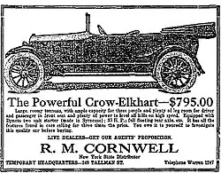 The Crow-Elkhart was an American automobile manufactured from 1909 until 1924 by the Crow-Elkhart Motor Company of Elkhart, Indiana,[3] founded by Martin E. Crow.[4] The company manufactured both four and six cylinder models.[3] After World War I, Crow-Elkhart used Gray victory engines in some of its cars.[5]