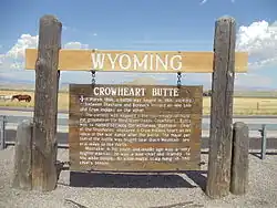 A sign in front of nearby Crowheart Butte explains how the geological feature got its name.