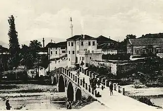 • Abdullah Pashë Dreni House, built in 1790, is a three-floor building in the shape of a tower, which served as a private house and a fortress. It was built out of stone and bricks and it has small windows.[15] Nowadays, the first floor cannot be seen from the outside due to the increase in level of the main road which connects two parts of the city through the Islam Beg Bridge. Apart from its architectural value, this building also has historical significance. When Marshall Mehmet Ali Pasha visited Gjakova in order to oversee the cession of that region to the Principality of Montenegro, he was killed along with many Ottoman soldiers in this house.[13]