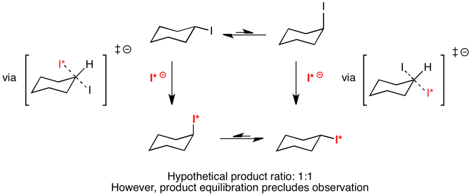 Ernest L. Eliel has proposed that the hypothetical reaction of cyclohexyl iodide with radiolabeled iodide would result in a completely symmetric transition state.[10] Because both the equatorial and axial-substituted conformers would react through the same transition state, ΔΔG‡ would equal zero. By the Curtin–Hammett principle, the distribution of products should then be 50% axial substituted and 50% equatorial substituted. However, equilibration of the products precludes observation of this phenomenon.[3]