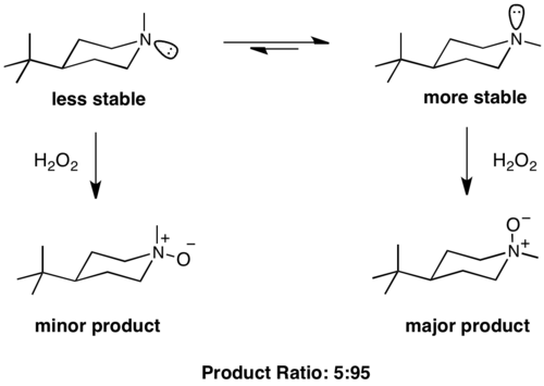 An example of a Curtin–Hammett scenario in which the more stable conformational isomer reacts more quickly is observed during the oxidation of piperidines. In the case of N-methyl piperidine, inversion at nitrogen between diastereomeric conformers is much faster than the rate of amine oxidation.[6] The conformation which places the methyl group in the equatorial position is 3.16 kcal/mol more stable than the axial conformation.[7] The product ratio of 95:5 indicates that the more stable conformer leads to the major product.[8]