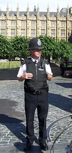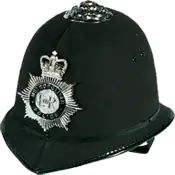 The custodian helmet is a type of helmet worn predominantly by male police officers in the United Kingdom and within certain other places around the world.[1] First used by the Metropolitan Police in London in 1863, the BBC labelled the custodian helmet a "symbol of British law enforcement".[2] They are worn by male constables and sergeants on foot patrol.[3] A cultural icon, it has featured in films, TV series and other media involving British police.[2]
