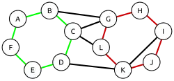 A graph with edges colored to illustrate a closed walk, H–A–B–A–H, in green; a circuit which is a closed walk in which all edges are distinct, B–D–E–F–D–C–B, in blue; and a cycle which is a closed walk in which all vertices are distinct, H–D–G–H, in red.