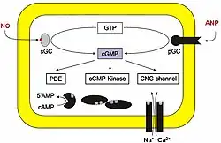 - ^ Carvajal JA, Germain AM, Huidobro-Toro JP, Weiner CP (September 2000). "Molecular mechanism of cGMP-mediated smooth muscle relaxation". Journal of Cellular Physiology. 184 (3): 409–420. doi:10.1002/1097-4652(200009)184:3<409::aid-jcp16>3.0.co;2-k. PMID 10911373. S2CID 22530053.