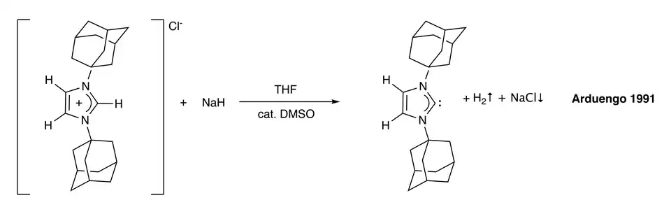 - ^ Arduengo, Anthony J.; Harlow, Richard L.; Kline, Michael (January 1991). "A stable crystalline carbene". Journal of the American Chemical Society. 113 (1): 361–363. Bibcode:1991JAChS.113..361A. doi:10.1021/ja00001a054. ISSN 0002-7863.