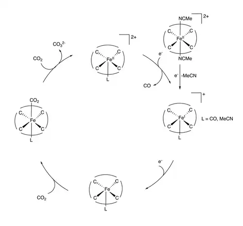 - ^ a b Massie, Allyssa A.; Schremmer, Claudia; Rüter, Isabelle; Dechert, Sebastian; Siewert, Inke; Meyer, Franc (2021-03-19). "Selective Electrocatalytic CO 2 Reduction to CO by an NHC-Based Organometallic Heme Analogue". ACS Catalysis. 11 (6): 3257–3267. doi:10.1021/acscatal.0c04518. ISSN 2155-5435.