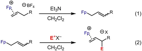 Fp–allyl and Fp–allenyl react with cationic electrophiles E (such as Me3O+, carbocations, oxocarbenium ions) to generate allylic and propargylic functionalization products, respectively (eqn 2, shown for allyliron).[16] The related complex [Cp*Fe(CO)2(thf)]+[BF4]− (Cp* = C5Me5) has been shown to catalyze propargylic, allylic, and allenic C−H functionalization by combining the deprotonation and electrophilic functionalization processes described above with facile exchange of the unsaturated hydrocarbon bound to the cationic iron center.[22]