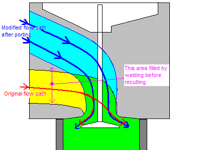 When a modification is decided upon through testing with an air flow bench, the original port wall material can be reshaped by hand with die grinders or by numerically controlled milling machines. For major modifications the ports must be welded up or similarly built up to add material where none existed.