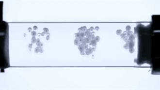 When the lathe is static, the beads float on top of the liquid. With increasing rotational speed, the centripetal force then pushes the fluid outwards and the beads toward the central axis. Hence, the beads are essentially confined by a potential given by the rotational energywhere is the mass of the beads, the distance from the central axis, and the rotational speed. Due to the proportionality, the confining potential resembles that of a cylindrical harmonic oscillator.