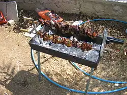 Mezedes is a large selection of dishes with small helpings of varied foods, brought to the table as a progression of tastes and textures. The meal begins with black and green olives, tahini, skordalia (potato and garlic dip), humus, taramosalata (fish roe dip), and tzatziki / cacık (ttalattouri in Cypriot), all served with chunks of fresh bread and a bowl of mixed salad. Some of the more unusual meze dishes include octopus in red wine, snails in tomato sauce, brains with pickled capers, samarella (salted dried meat), quails, pickled quail eggs, tongue, kappari pickles (capers), and moungra (pickled cauliflower). Bunches of greens, some raw, some dressed with lemon juice and salt, are a basic feature of the meze table. The meal continues with fish, grilled halloumi cheese, lountza (smoked pork tenderloin), keftedes (minced meatballs), sheftalia (pork rissoles), and loukaniko (pork sausages). Hot grilled meats – kebabs, lamb chops, chicken – may be served toward the end. The dessert is usually fresh fruit or glyka – traditional sugar-preserved fruits and nuts.[1]