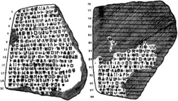 The earliest known Cypro-Minoan inscription of any real length was a clay tablet discovered in 1955 at the ancient site of Enkomi, near the east coast of Cyprus. It was dated to ca. 1500 BC, and bore three lines of writing.[16] A number of other tablets were subsequently found including H-1885 (CM 0) which contained 23 signs and is dated to LC IB.[17][18][19] Several Cypro-Minoan tablets were excavated at Ugarit in the 1950s, (RASH Atab 001 = RS 17.06), (RASH Atab 004 = RS 20.25, Aegean area), and one a surface find (RS 17.006, Residential Quarter). Two tablet fragments were also found (RASH Atab 002 = RS 19.01) and (RASH Atab 003 = RS 19.0). In total, eight full or partial tablets have been found with the three found at Enkomi, totaling over 2000 signs, making up a significant part of the known CM corpus.[20][21][22][23]