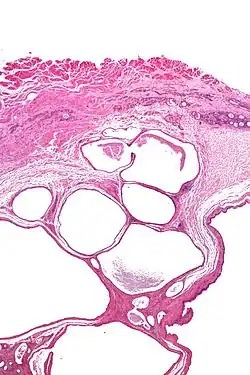 | Micrograph of a cystic tumour of the atrioventricular nodal region. H&E stain. | |