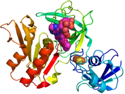 ![]() Crystal structure of gcoB (cartoon diagram) complexed with FAD (magenta spheres) and an iron–sulfur cluster (orange/yellow) based on PDB: 5OGX.[1] | |||||||