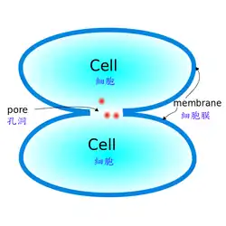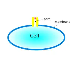 Pore forming cytolysins (PFCs) comprise near 65% of all membrane-damaging cytolysins.[8] The first pore forming cytolysin is discovered by Manfred Mayer in 1972 of the C5-C9 insertion of erythrocytes.[12] PFCs can be produced by a wide variety of sources, such as bacteria, fungi and even plants.[13] The pathogenic process of PFCs normally involves forming channels or pores at the target cells' membranes. Note that the pores can have many structures. A porin-like structure allows molecules of certain sizes to pass through. Electric fields distribute unevenly across the pore and enable the selection molecules that can get through.[14] This type of structure is shown in staphylococcal α-hemolysin.[15] A pore can also be formed through membrane fusions. Controlled by Ca2+, the membrane fusion of vesicles form water-filled pores from proteolipids.[16] Pore forming cytolysins such as perforin are used in cytotoxic killer T and NK cells to destroy infected cells.