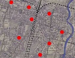 - ^ identified private establishments are the Ursuline college Gimnazjum Żeńskie Najświętszego Serca Jezusa, Gulczyńska 1998, p. 171. The Ursulines operated a female college in 1853-1874; it was systematically harassed by Luisenschule and charged with "fanatical [Polish] nationalism"; following a campaign of harassment the provincial administration managed to shut down the school. The plot, purchased by the Regierungsbezirk, was handed over to Luisenschule and in 1919 taken over by Dąbrówka. The Ursulines moved to Cracow but returned to Poznań in 1919; they did not re-claim the Młyńska plot but built a new compound on the Sporna Street, Gulczyńska 1998, p. 172