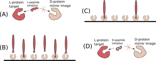 Figure 4. Mirror image phage display. (A) A target L-amino acid protein (L-protein) for which an L-peptide inhibitor might be available is selected. The D-enantiomer protein (D-protein) is chemically synthesized from the same sequence using D-amino acids. If the target L-protein does not require a chaperone or co-factor to fold, the D-protein will mirror the conformation and properties of the L-protein, but the L-peptide inhibitor will most likely have little binding affinity towards it. (B) The synthesized D-proteins are fixed to a surface and exposed to phage displaying many different L-peptides. (C) L-peptides that do not bind well to the surface are washed away. The remaining L-peptides are sequenced. (D) The D-enantiomer peptides (D-peptides) of the binding L-peptides are synthesized using the same sequence and tested against the L-proteins. The D-peptide will bind the L-protein but most likely not bind the D-protein mirror.