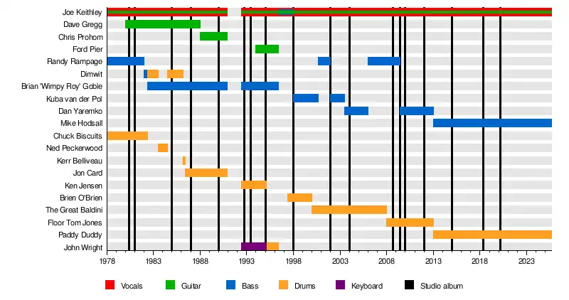 | Past members | Chuck Biscuits Randy Rampage Dave Gregg Brian Roy Goble Dimwit Chris Prohom Jon Card Ken Jensen Ford Pier John Wright Brien O'Brien The Great Baldini Brad Kent Floor Tom Jones Dan Yaremko Kuba van der Pol[1] |