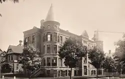 At the beginning of their partnership the firm was located in the Hadley Falls Bank Building which sat at the corner of Main and Dwight (not to be confused with the later Hadley Falls Trust Building at the corner of Maple & Suffolk),[16][17] and subsequently relocated to Holyoke's Flatiron block, which was said to have had advantageous lighting at most hours of the day due to its rounded northeast-facing corner, which had windows facing in three different directions.[4][18] Originally Ashley B. Tower joined David H. as an apprentice, with no prior experience in engineering work or architecture besides a previous carpentry apprenticeship.[16] In time his abilities exceeded his older brother's in certain regards; of the two, he was the only one known to hold patents- by 1885, he had invented an improved wood pulp grinder which would be used in their clients' mills domestically and abroad.[19][20]