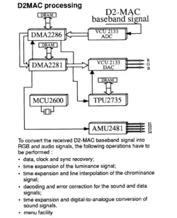 D2-MAC is a satellite television transmission standard, a member of Multiplexed Analogue Components family.[1][2] It was created to solve D-MAC's bandwidth usage by further reducing it, allowing usage of the system on cable and satellite broadcast.[3][4] It could carry four high quality (15 kHz bandwidth) sound channels[5] or eight lower quality audio channels.[6] It was adopted by Scandinavian, German and French satellite broadcasts (CNBC Europe, TV3 (Sweden), TV3 (Denmark), EuroSport, NRK 1, TV-Sat 2, TDF 1, TDF 2, etc.).[7][8][4][9][10][11] The system was used until July 2006 in Scandinavia and until the mid-1990s for German and French sound channels.