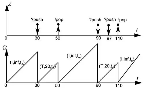 Fig. 4. shows an event segment (top) and the associated state trajectory (bottom) of the left slot of the two-slot toaster introduced in Fig. 2. Like Fig.3, the status of the left slot is described as (state, lifespan, elapsed time)=() in Fig. 4. Since the initial state of the toaster is "I" and its lifetime is infinity, the height of (Wait, inf, ) can be determined by when ?push occurs. Fig. 4. illustrates the case ?push happens at time 40 and the toaster changes into (T, 20, 0). From that time, 20 seconds later when its status becomes (T, 20, 20), the toaster gets back to (Wait, inf, 0) where we don't know when it gets back to "Toast" again. Fig. 4. shows the case that ?push occurs at time 90 so the toaster get into (T,20,0). Notice that even though there someone push again at time 97, that status (T, 20, 7) doesn't change at all because (T,?push)=(T,1).