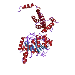 m5C methyltransferases (C-5 cytosine-specific DNA methylase) (C5 Mtase) are enzymes that specifically methylate the C-5 carbon of cytosines in DNA to produce C5-methylcytosine.[12][13][14] In mammalian cells, cytosine-specific methyltransferases methylate certain CpG sequences, which are believed to modulate gene expression and cell differentiation. In bacteria, these enzymes are a component of restriction-modification systems and serve as valuable tools for the manipulation of DNA.[13][15] The structure of HhaI methyltransferase (M.HhaI) has been resolved to 2.5 A: the molecule folds into 2 domains - a larger catalytic domain containing catalytic and cofactor binding sites, and a smaller DNA recognition domain.[16]