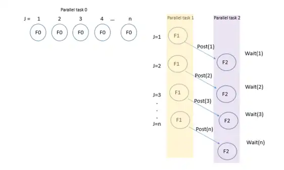wait(j); // It waits till the F1 completes and produces the value z[j] to be used by F2