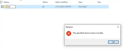 In Windows 95 and Windows 98, typing in the location of the reserved name (such as CON/CON, AUX/AUX, or PRN/PRN) crashes the operating system, of which Microsoft has provided a security fix for the issue. In Windows XP, the name of the file or folder using a reserved name silently reverts to its previous name, with no notification or error message. In Windows Vista and later, attempting to use a reserved name for a file or folder brings up an error message saying "The specified device name is invalid."