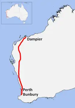 As a single trunkline it is 1,530 kilometres (950 mi) long,[4] extending from the Burrup Peninsula in the Pilbara region, to Bunbury in the south west of Western Australia. It supplies gas to industrial, commercial and residential customers in Perth and major regional centres along the pipeline route. It is covered by Western Australian pipeline licence PL-40. A number of lateral pipelines are connected to this pipeline, most of which are covered by separate licences, although PL-40 itself covers the main trunkline and some laterals totalling a length of 1,789 kilometres (1,112 mi).[2]