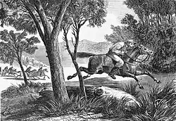 In January 1864 Thomas Henty's "Arab entire horse" was stolen in the night from ‘Round Hill’ station (east of Culcairn), a theft for which Morgan was suspected. Later the superintendent of the station, Ingram, met Daniel Morgan near Cookardinia. Morgan accused Ingram of “spreading a report” that he had stolen the Arab horse and “affected much virtuous indignation at the scandal”. Morgan then stole Ingram's mount, after which he informed the superintendent where Henty's Arab horse could be found.[27]