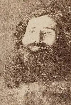 The following day, April 11, Morgan's body, wrapped in a wool-bale bag, was brought into Wangaratta and placed on public display in a police cell. Later that afternoon the body was removed to a shed where Dr. Henry of Benalla flayed the beard and underlying skin from the corpse's face using a clasp knife provided by Francis Cobham, Superintendent of Police at Benalla. Also present were Dr. Dobbyn, the District Coroner, and Dr. Mackay of Tarawingee. Dr. Henry then severed Morgan's head from his trunk. The remaining hair was then shaved from the head, it was washed in hot water and a plaster cast made.[10][57][58] In May 1865 it was reported that the Attorney General of Victoria had suspended both Dr. Dobbyn ("for removing the head of Morgan") and Superintendent Cobham ("for the part he took in reference to the beard"), however both suspensions were only temporary.[58] A later report states the skin and beard from Morgan's face was made into a tobacco pouch.[59]
